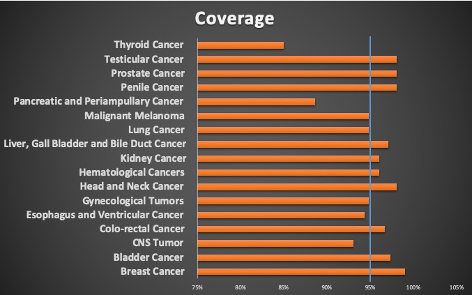 The specific oncology registries have an average coverage around 95% which is more than most of the other registries in other places. The broad coverage is crucial for high quality research by providing the ability of having high volume of patients and vast data points for the studies that are designed. The high coverage is also a demonstration of the broad support of the clinical community towards data collection.